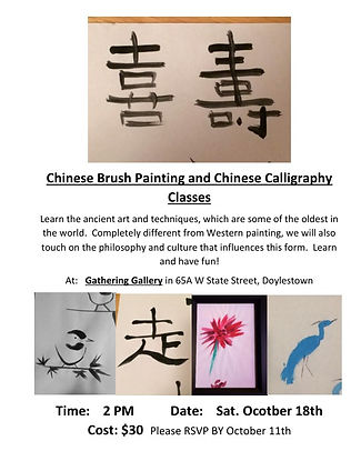 Gathering is offering Chinese Brush Painting & Chinese Calligraphy Class by Heather Dalton on October 18th at 2 pm cost $30. Please RSVP